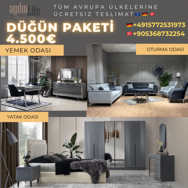 -Aydınlife mobilya olarak Tüm Avrupa ülkelerine Ücretsiz Kapı-Teslim seçeneği ile düğün Paketleri sunmaktayız;