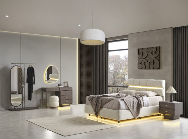 - Kapaklı gardırop – şifonyer ve aynası – 2 adet komodin- boy aynasi, askilik, Yatak- Baza- Başlık takım fiyatına dahildir.