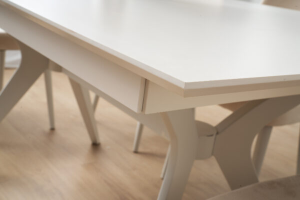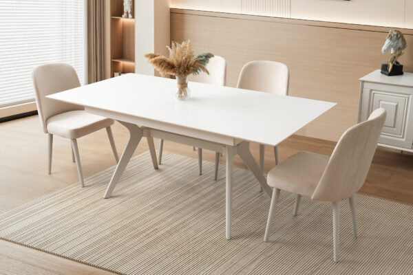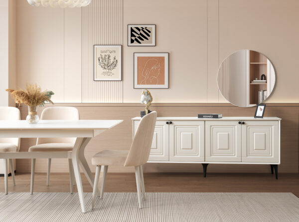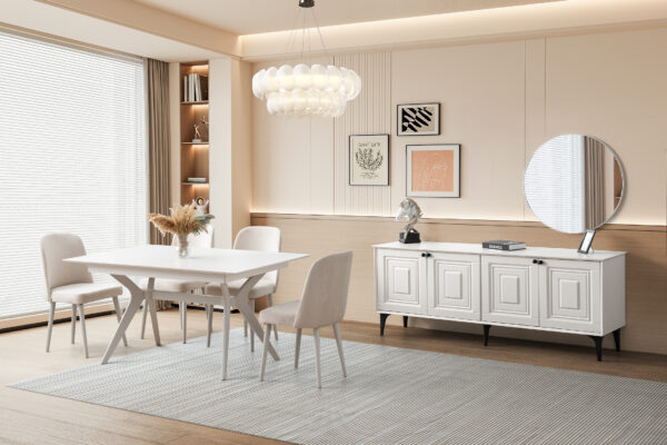Manavgat yemek odası takımı, modern tasarımı ve işlevselliğiyle yaşam alanlarınıza şıklık katmak üzere tasarlanmıştır. Bu takım, masa, dört adet sandalye, TV ünitesi ve konsoldan oluşmaktadır.