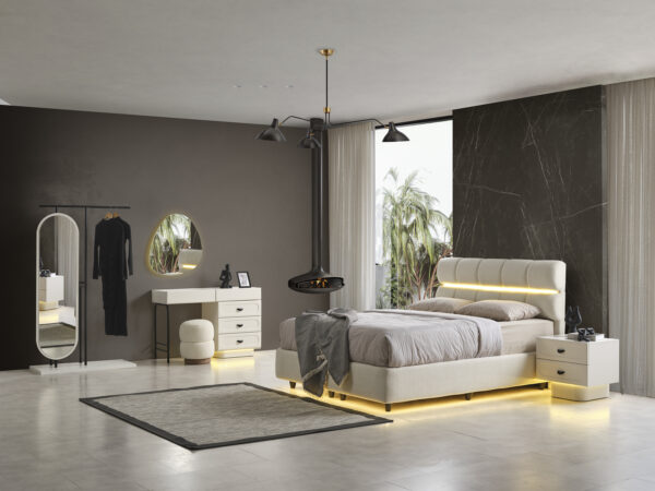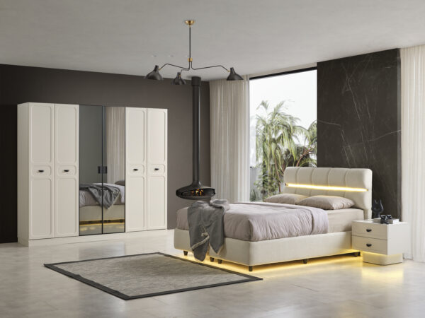 - Kapaklı gardırop – şifonyer ve aynası – 2 adet komodin- boy aynasi, askilik, Yatak- Baza- Başlık takım fiyatına dahildir.